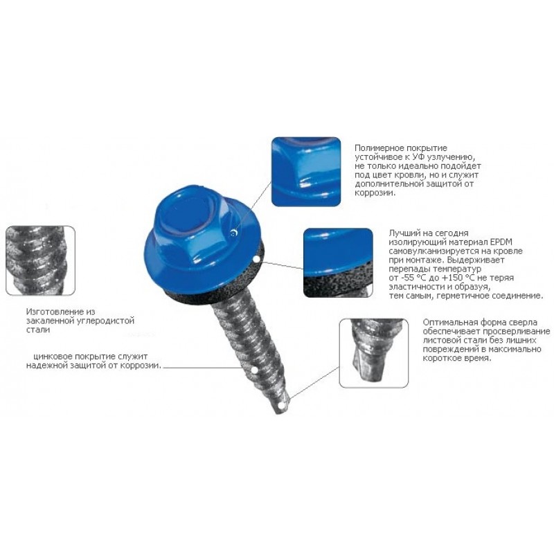 Саморезы кровельные по металлу изготавливаются из углеродистой стали. Дополнительно саморезы имеют покрытие из цинка, защищающее их от коррозии. В комплекте с саморезами идут резиновые прокладки и шайбы. Резиновые прокладки защищают резьбовое соединение самореза от просачивания влаги по резьбе. На конце самореза имеется сверло. Головка самореза шестигранная.