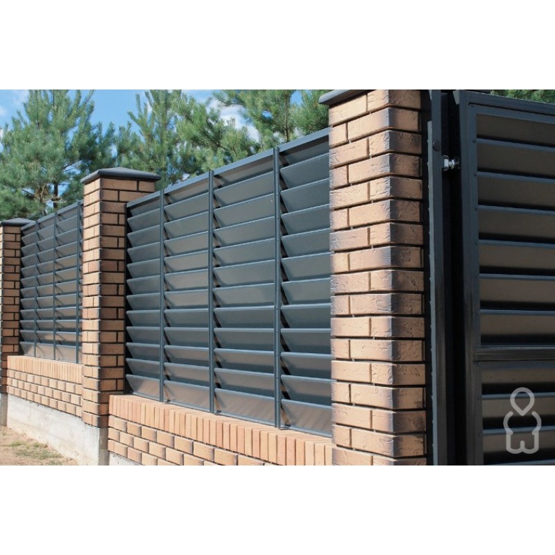 Заборы-жалюзи становятся все более популярными в силу оригинальности модели горизонтального забора. С одной стороны, они позволяют избежать чрезмерной обзорности заборов из металлоштакетника (забор-жалюзи просматривается только со стороны участка), а с другой — в отличие от «глухих» ограждений из профнастила не кажутся громоздкими. Секция забора-жалюзи состоит из отдельных расположенных под углом друг к другу завальцованных металлических ламелей, опорных столбов с заглушками и центральной планки, усиливающей конструкцию. Элементы секции скрепляются между собой саморезами и заклепками.